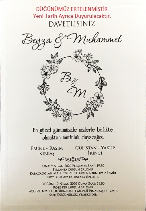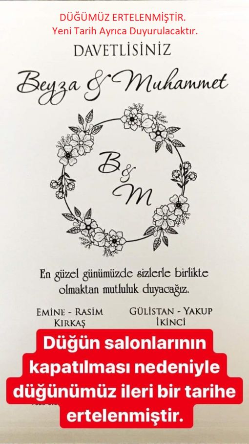 İçişler Bakanlığı tarafından CORONOVİRÜS Tehdidi nedeniyle alınan önlemler kapsamında düğün salonlarının kapatılması nedeniyle Dernek Başkanımız Rasim KIRKAŞ'ın kızını evlendireceği düğün ertelenmiştir.