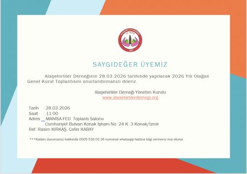 Alaşehirliler Derneğinin 12. Olağan Genel Kurul Toplantısı Yönetim ve Denetim Kurulu üyelerinin seçimi ve Manisalı Dernekler Federasyonuna Üyelik Hakkında Yönetim Kuruluna Yetki Verme gündemiyle 31.01.2026 Cumartesi günü Saat 10:30'da Mansuroğlu, Sakarya Cd. No: 20 Bayraklı / İzmir adresinde bulunan Değirmen Cafe Tesisleri Kafeteryasında yapılacağı duyurulmuştu.